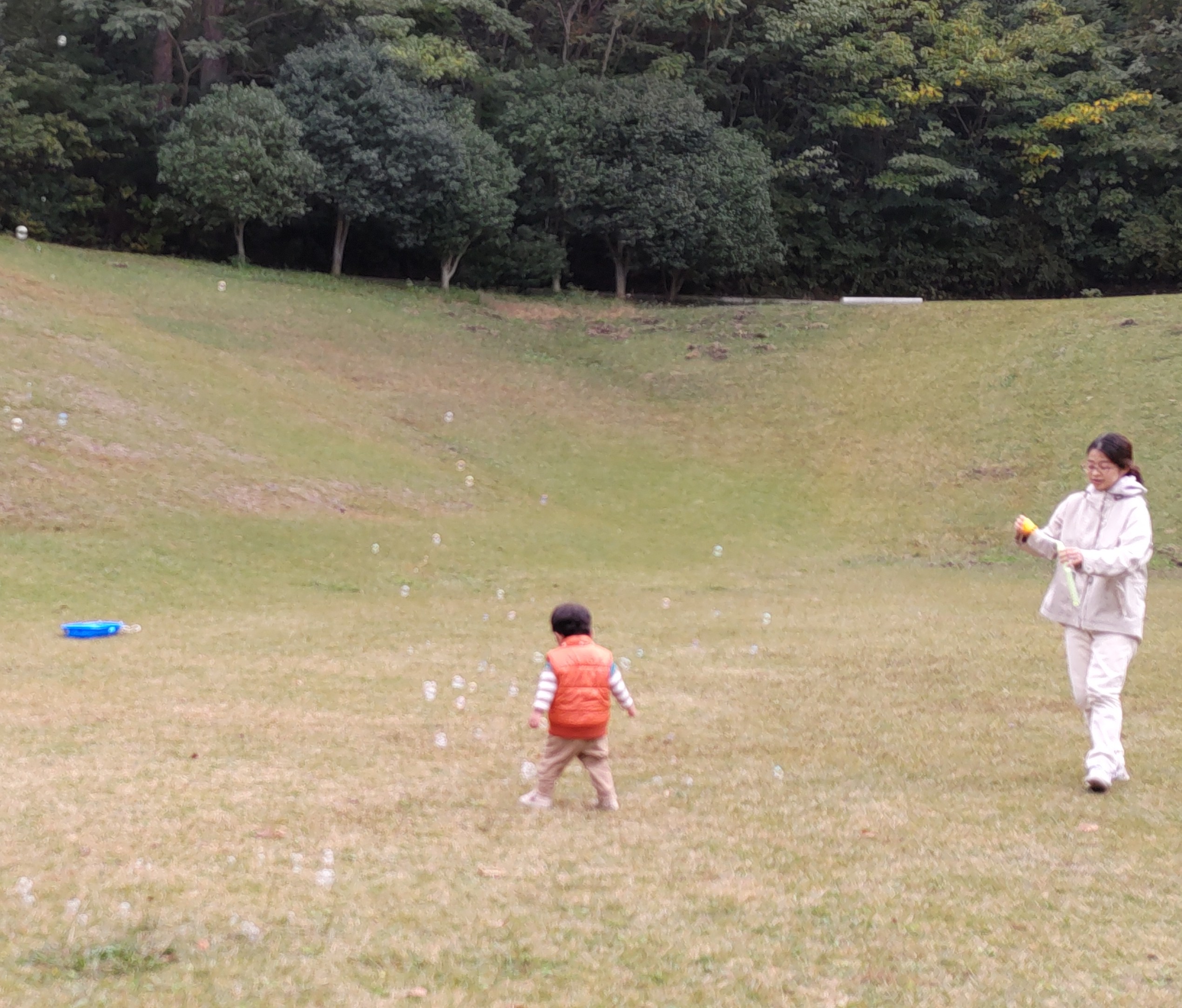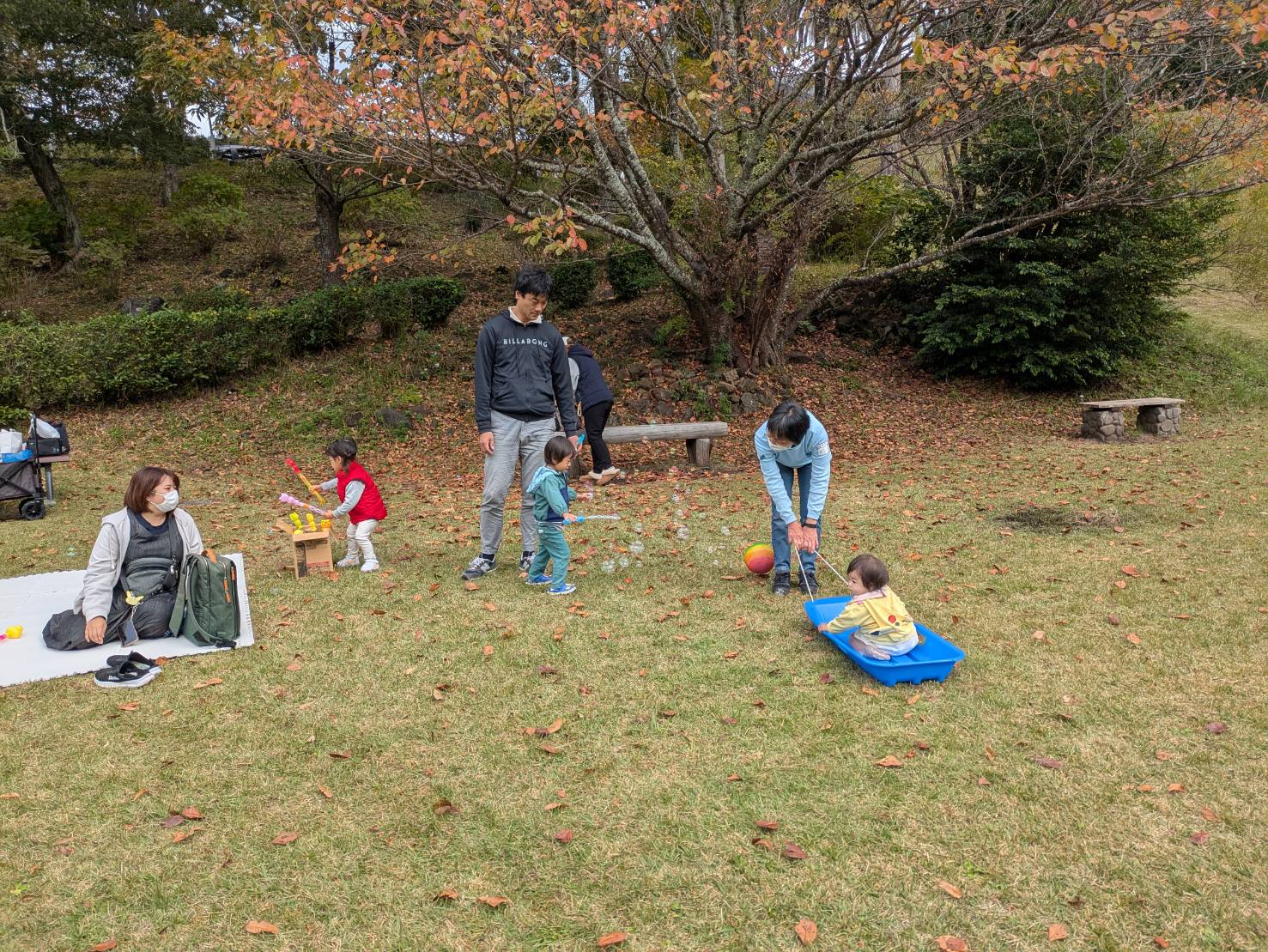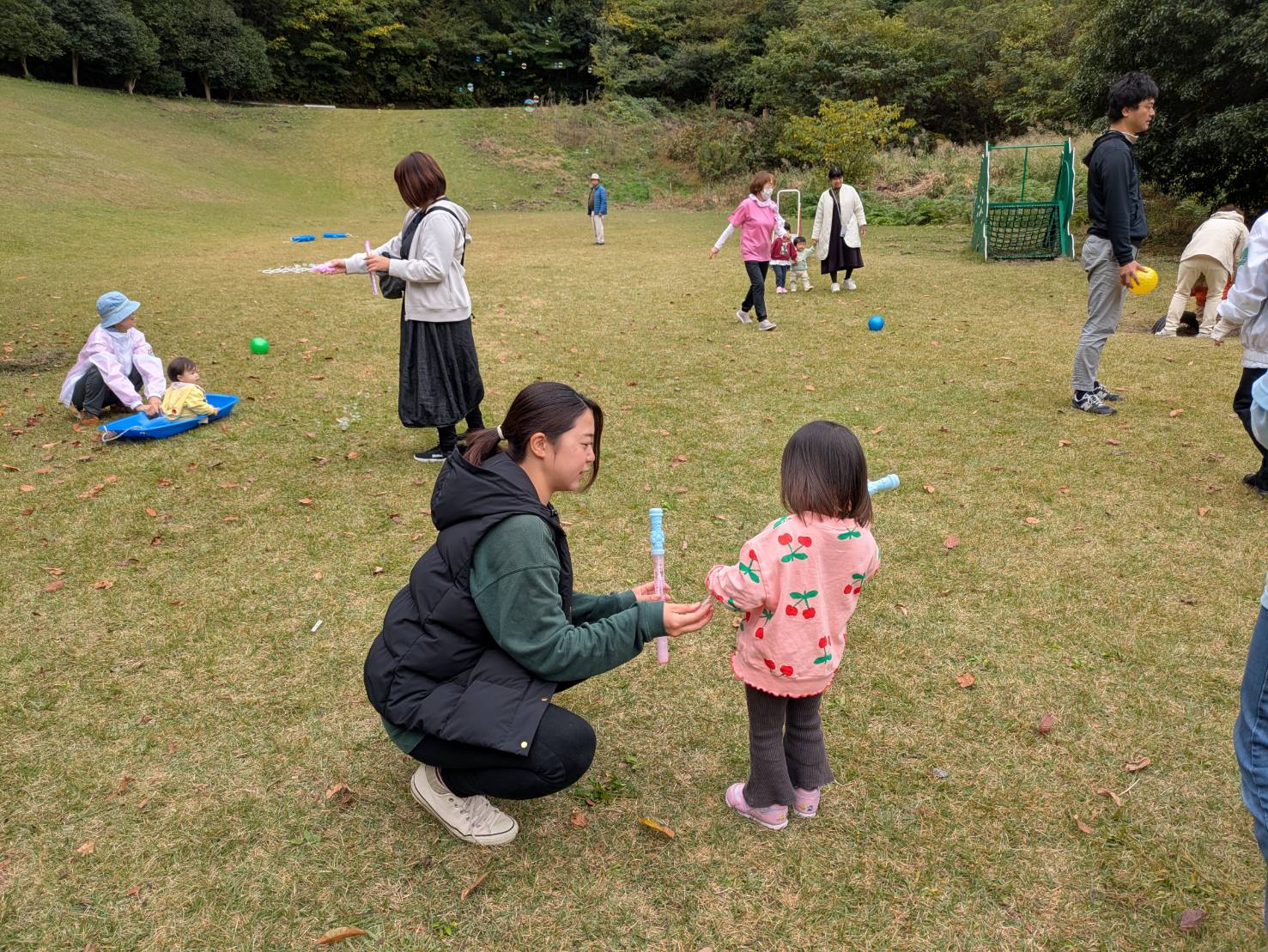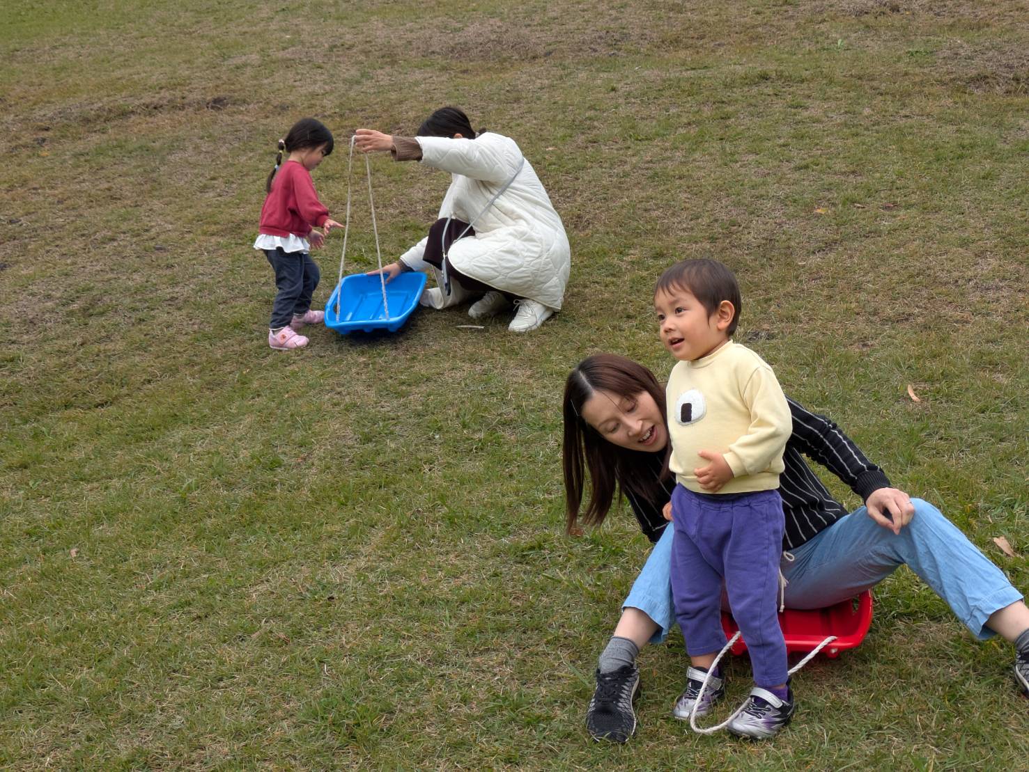 子供は風の子というように元気に走ったり、沢山のシャボン玉を飛ばしたり、遊具で遊んだり、ソリ遊びをしたり、思い思いの遊びを楽しみました。