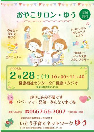 28日㈯ 健康福祉センター2F 10:00〜11:40。パパ・ママ・兄弟、みなさんでご参加ください。申し込みは不要です。